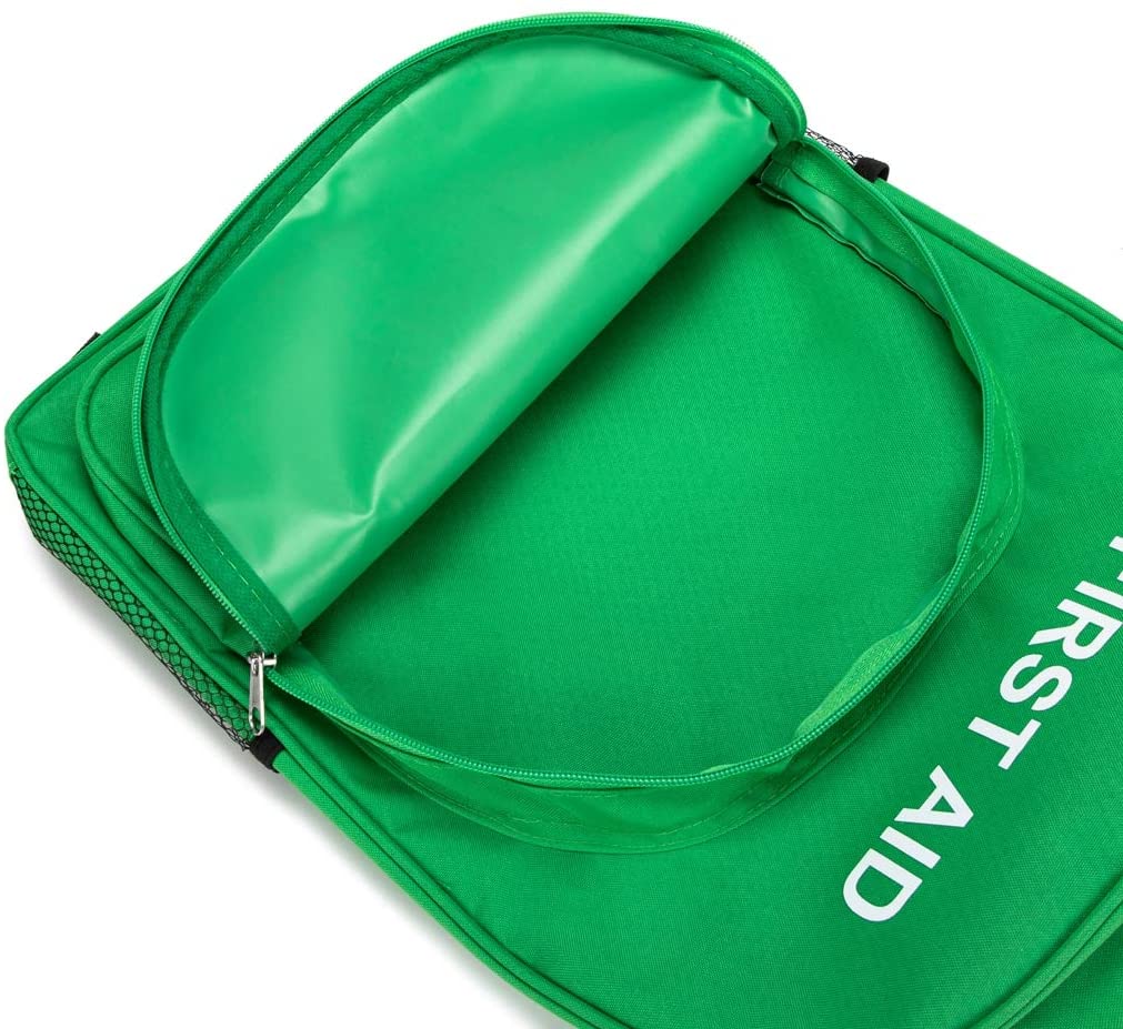 Feart de bhaga-droma ciad-chobhair Green Nylon: Zipper furasta, luchd-roinn earrannan airson eagrachadh agus gu math farsaing. Tha samhla crois air a ’phoca leigheis air beulaibh. Dìreach air eagal ‘s gum bi buill do theaghlaich a-riamh nan aonar chì daoine eile.Fillable, sturdy, practaigeach agus aotrom.